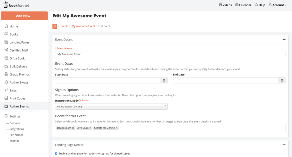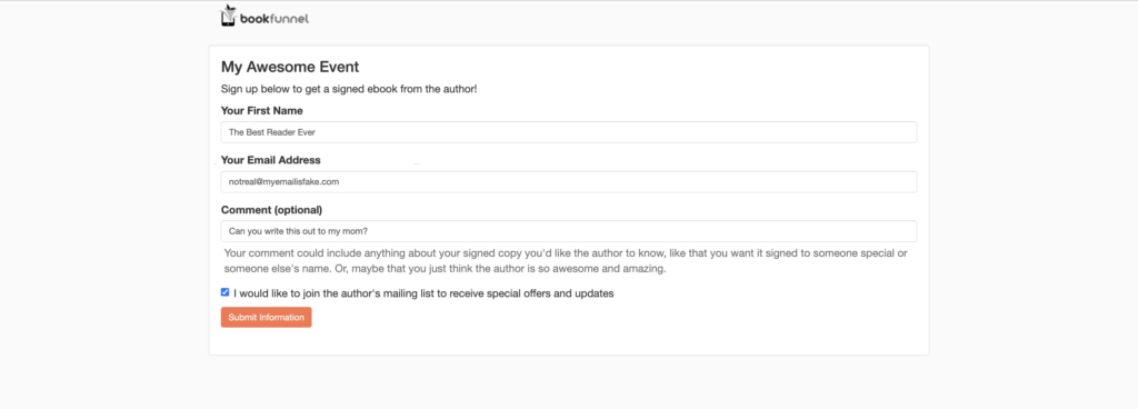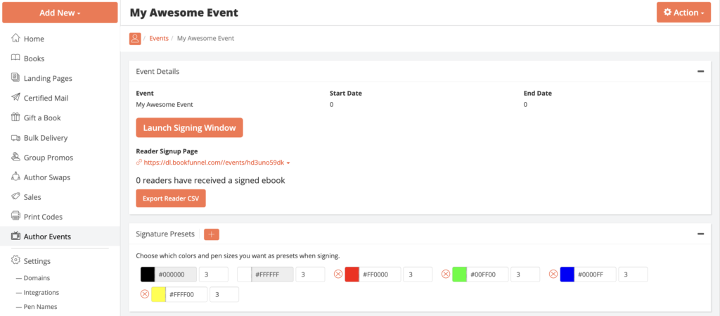 Reader Signup Page – This is a form you can share with your readers to sign up for a signed ebook at your event. The form is hosted on the customized landing page you created.