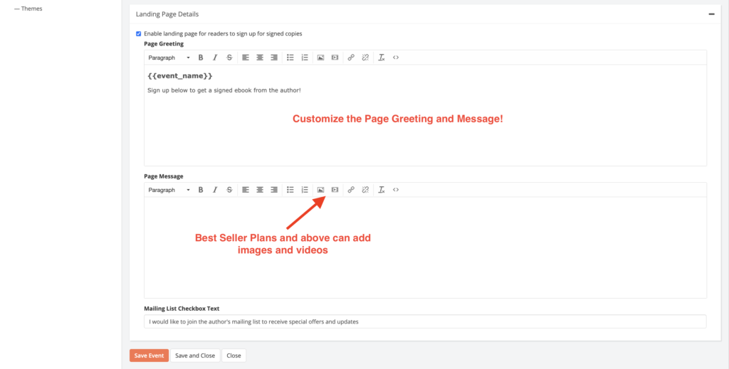 - Fill in Landing Page Details – This will create a landing page that your readers will see when they click the signup link or scan the QR code. You can customize the Page Greeting and the message that appears under the signup form. If you have a Best Seller or Publisher account, you can add images to this page to enhance the experience.