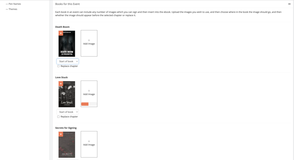 This section lists all the books you selected to offer for this signing event. You can add or remove books at any time by editing the event.