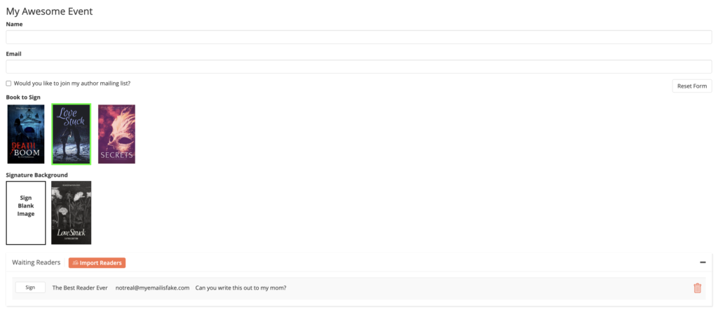 - Waiting Readers: This is where any readers that filled out your landing page form will be listed, waiting for you to sign their book. When you click the “Sign” button for a reader, it will automatically populate their name and email address at the top of the page.